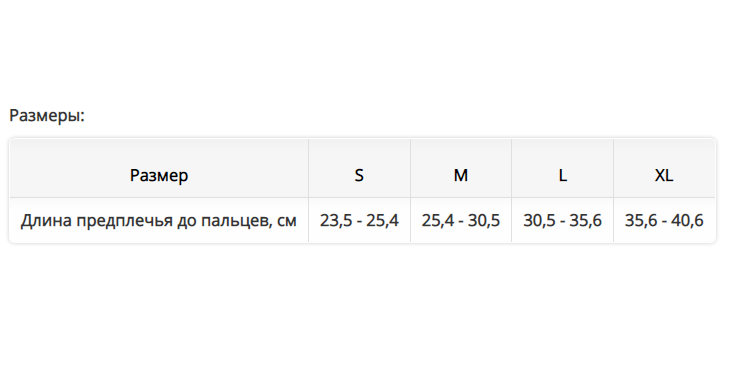 | Длина предплечья до пальцев, см | 23,5 - 25,4 | 25,4 - 30,5 | 30,5 - 35,6 |