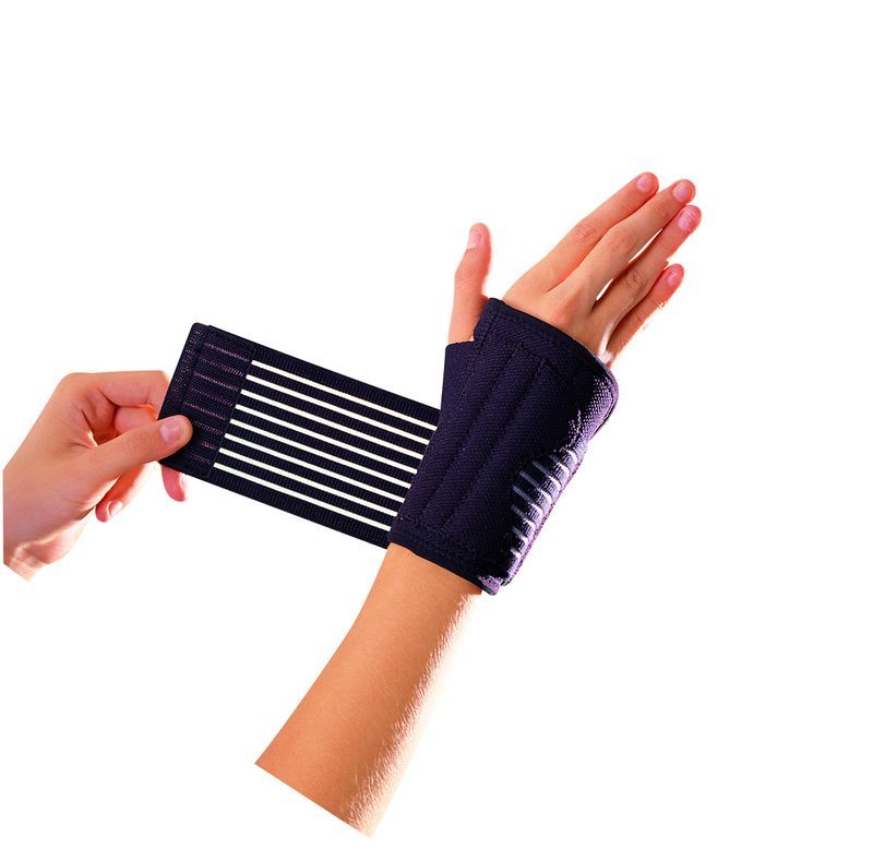 Гибкие шины с ладонной и дорсальной сторон запястья помогают поддерживать лучезапястный сустав в нейтральном положении. Широкая эластичная лента регулирует натяжение. Не ограничивает движения пальцев. Снимает и помогает предотвраить боль, воспаление и отек при растяжении, артрите, тендините.