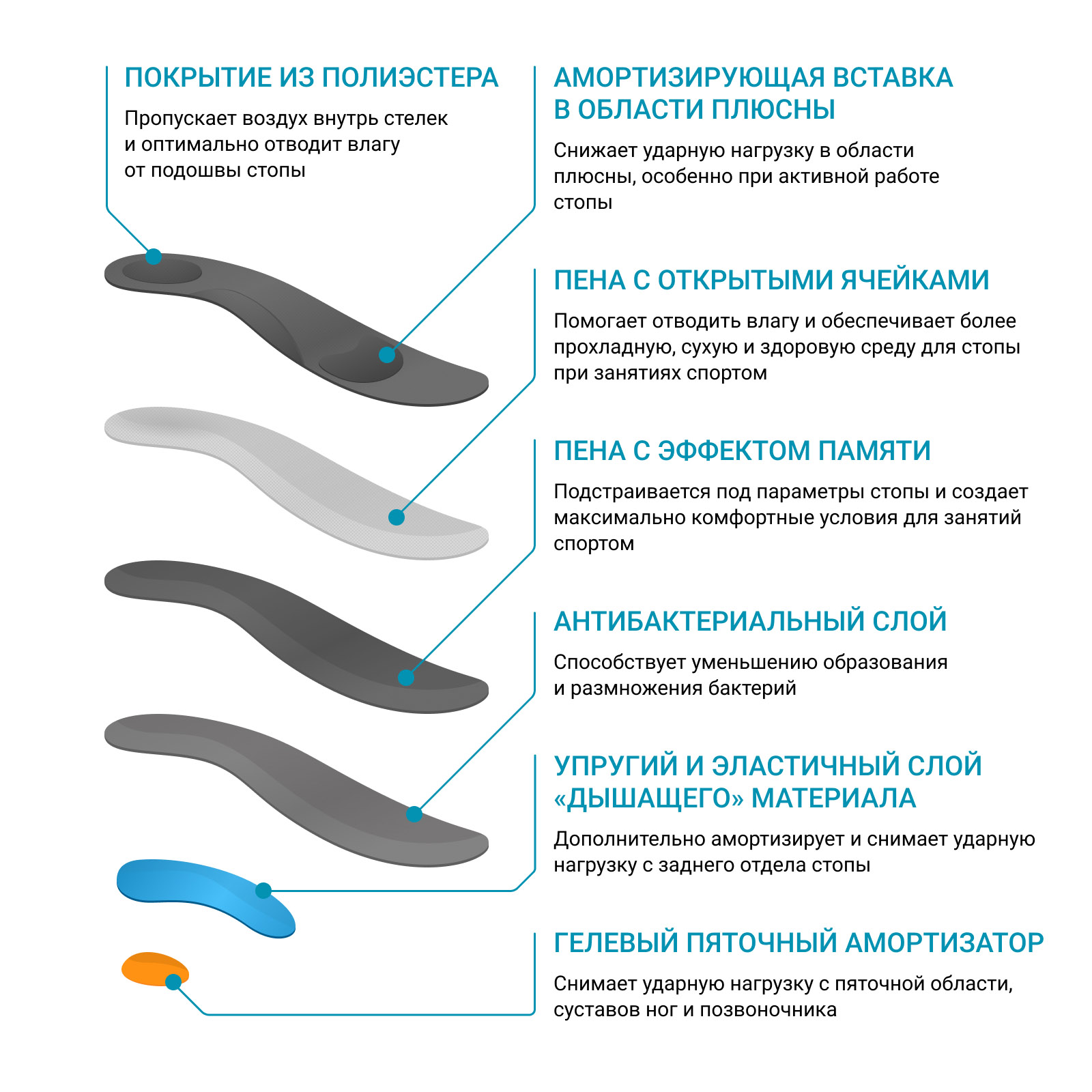 • Микропористый полимерный слой обеспечивает максимальную амортизацию всей стопы при повышенных нагрузках;