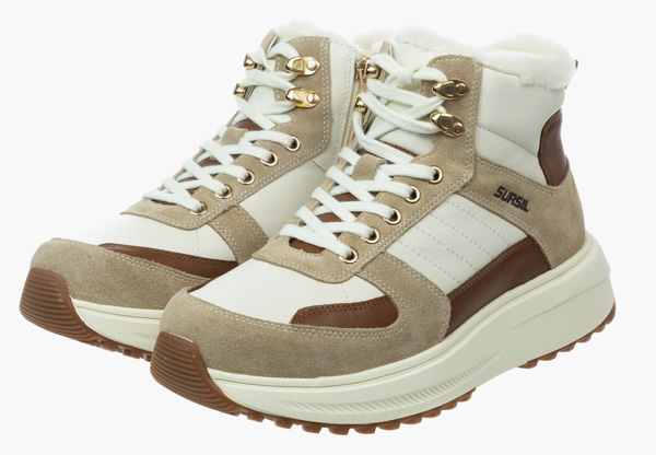 Верх из натуральной кожи белого цвета в сочетании с нубуком светлых и темных оттенков бежевого, дополненный сливочно белой подошвой с каучуковым протектором - образец актуального стиля в сочетании с комфортом. Белая шерстяная подкладка и покрытие стельки обеспечат ногам тепло при минусовых температурах. Застежка на молнии с внутренней стороны в дополнение к шнуровке значительно повышает удобство надевания. Анатомическая стелька с выраженной поддержкой сводов способствует распределению нагрузки на ноги и снижению усталости при ходьбе. Голеностоп надежно удерживается от завала плотным задником. Модель остаточно легкая благодаря подошве из вспененного материала ЭВА, который еще и отлично амортизирует, а противоскользящий протектор обеспечивает устойчивость даже на скользких поверхностях. Подошва имеет перекатный профиль, что значительно снижает усталость при длительной ходьбе.
