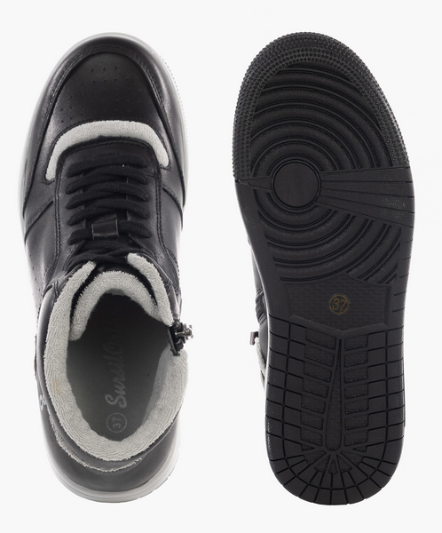 Ботинки выполнены из натуральной кожи и отлично подойдут для переменчивой погоды. Модель по мотивам знаменитых Air Force - это технологичная комбинация комфорта, стиля и мягкой поддержки ваших стоп. Формоустойчивый задник обуви фиксирует пятку и предотвращает заваливание стопы. Модель имеет вкладную ортопедическую стельку для разгрузки стопы. Подошва из износоустойчивой резины защищает стопу от ударной волны при ходьбе. Ботинки выполнены из черной натуральной кожи, внутри дышащая текстильная подкладка. Область голеностопа в обуви оснащена мягкой вставкой, которая исключает натирание. Шнуровка в сочетании с молний сбоку позволяют быстро снимать и надевать обувь.